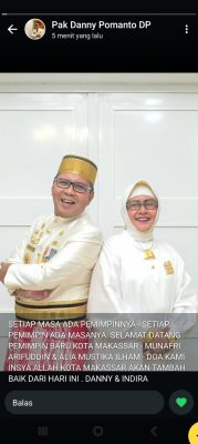 “Setiap masa ada pemimpinnya, setiap pemimpin ada masanya. Selamat datang pemimpin baru Kota Makassar, Munafri Arifuddin dan Aliyah Mustika Ilham. Doa Kami InsyaAllah Kota Makassar Akan Tambah Baik Dari Hari ini. Danny dan Indira,” tulis Danny, siang tadi, Rabu (5/02/2025).