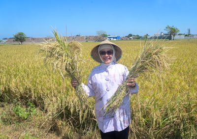 Selain memberikan motivasi kepada para petani, Indira juga melakukan peninjauan langsung ke sawah yang siap untuk dipanen.