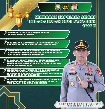 SIDRAP, KORANMAKASSAR.COM — Kapolres Sidrap AKBP Erwin Syah, S.I.K.M.H mengeluarkan himbauan dalam rangka untuk menjaga situasi keamanan dan ketertiban masyarakat (Kamtibmas) tetap kondusif selama bulan suci Ramadhan 1445 Hijriah tahun 2024.
