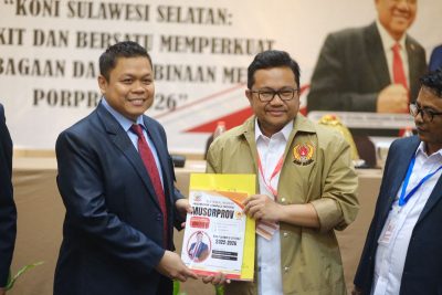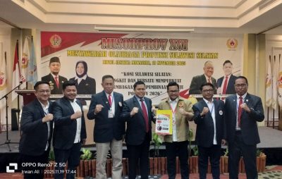 MAKASSAR, KORANMAKASSAR.COM — Musyawarah Olahraga Provinsi (Musorprov) XVI Komite Olahraga Nasional Indonesia (KONI) Sulawesi Selatan resmi berakhir dengan sukses pada 19 November 2025 di Hotel Santika Makassar. Agenda puncak ini menetapkan Darmawangsyah Muin sebagai Ketua Umum KONI Sulsel periode 2025–2029 melalui keputusan aklamasi.