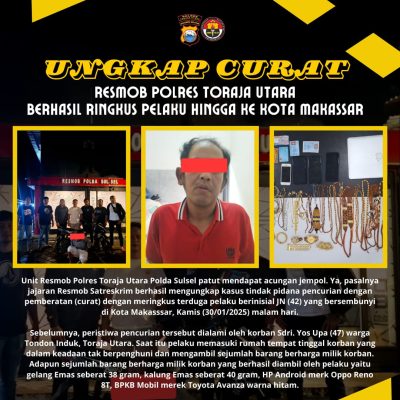 Kapolres Toraja Utara AKBP DR. Zulanda, S.I.K., M.Si melalui Kasat Reskrim Iptu Ridwan, S.H., M.H saat dikonfirmasi Senin (03/02/2024) menjelaskan bahwa benar pihaknya telah berhasil melakukan pengungkapan dengan mengamankan seorang pria terduga pelaku Curat berinisial JN (42) warga Kota Surabaya, Jawa Timur.