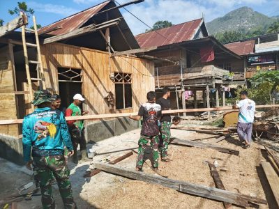 Warga setempat juga turut bergotong-royong dalam proses pembangunan rumah, mulai dari pengangkutan material hingga bantuan teknis ringan, mencerminkan semangat kemanunggalan TNI dan rakyat.